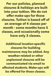Tuition fees listed are the price per month and that covers an average of 4 classes per month. Our classes are continuous enrollment, so your account will be billed and auto-drafted on the 1st of the month for the monthly tuition rate. If you ever want to discontinue your registration, we require an emailed 30-day drop notice to be dropped from any class. If you enroll mid-month, then the tuition will automatically be prorated.